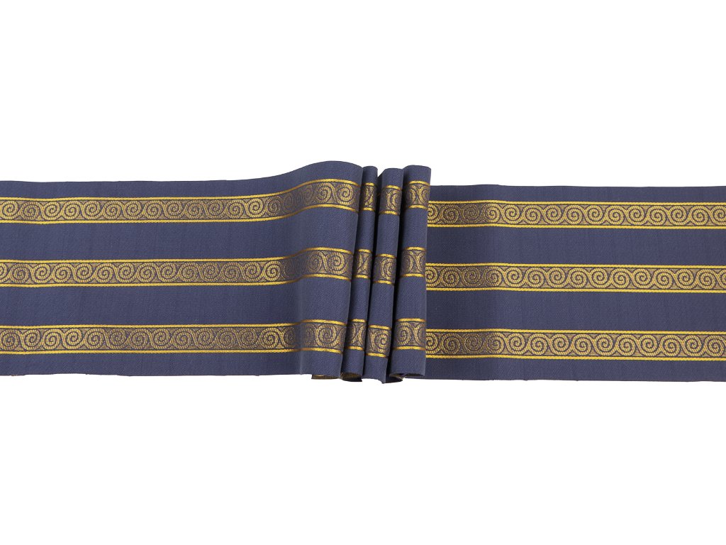 Luxusní historická stuha inspirovaná antickým uměním. Precizní tkaný vzor s motivem spirál (volut/meandr) vychází z dekorativních prvků starověkého Řecka a Říma. Vhodná pro historické rekonstrukce, divadelní kostýmy, liturgické oděvy i exkluzivní řemeslné projekty.