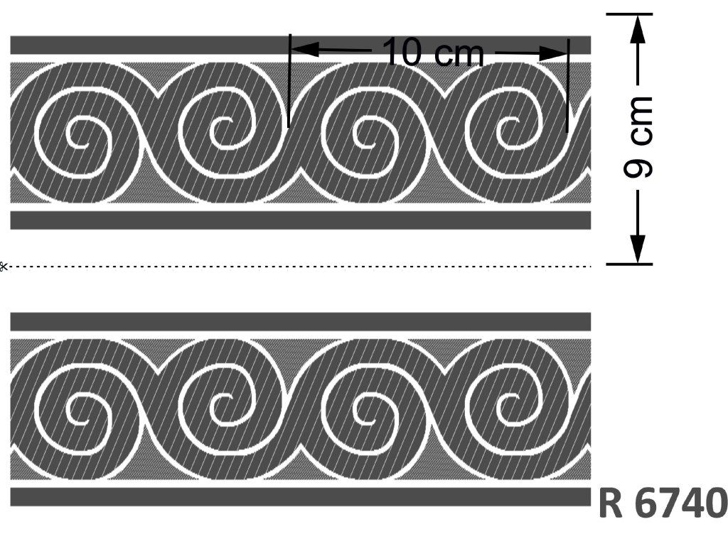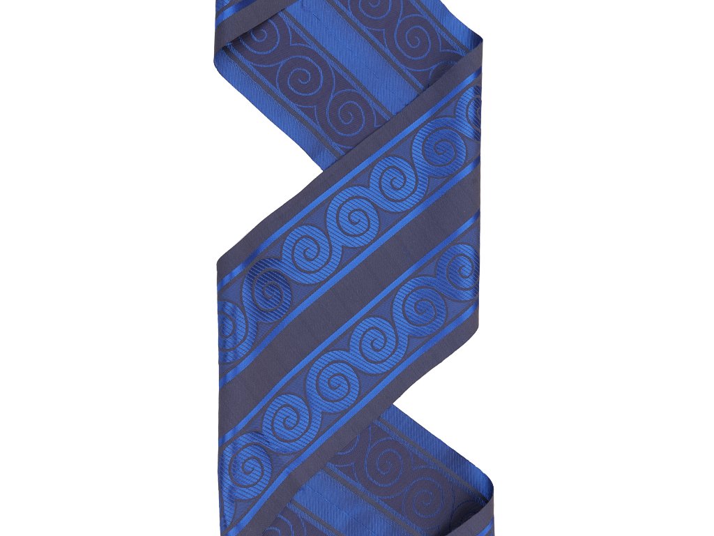 Luxusní historická stuha inspirovaná antickým uměním. Precizní tkaný vzor s motivem spirál (volut/meandr) vychází z dekorativních prvků starověkého Řecka a Říma. Vhodná pro historické rekonstrukce, divadelní kostýmy, liturgické oděvy i exkluzivní řemeslné projekty.
