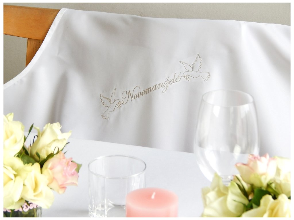 Aby jste si svůj velký den užili naplno vyladili jsme pro vás detaily, na kterých záleží. Jedním z detailů je právě tento bryndák s výšivkou "novomanželé" a zamilovaných hrdliček.
