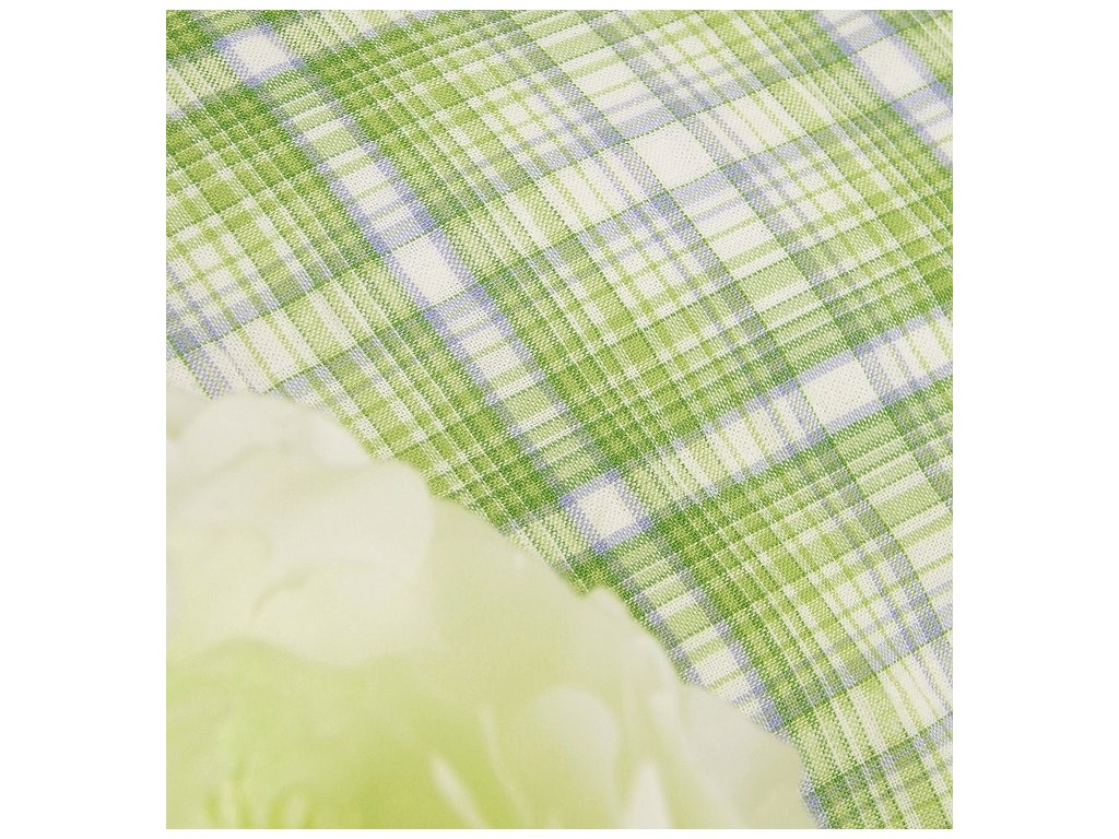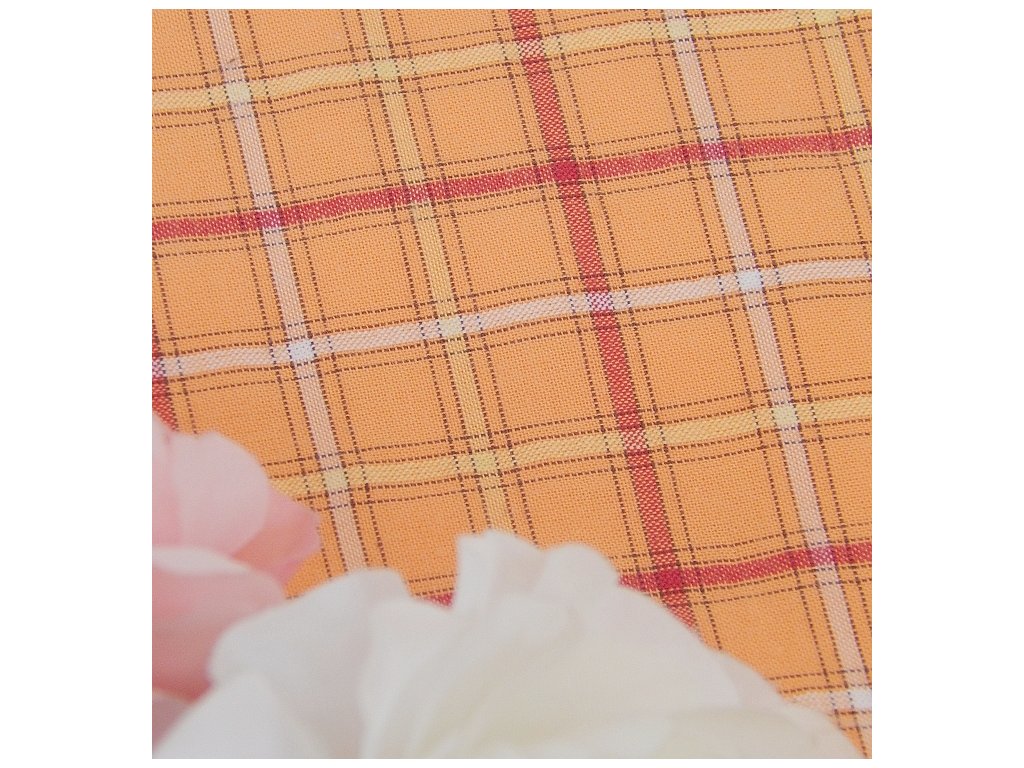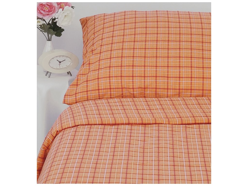 Povlečení má vytkávaný vzor - káro v barvě oranžové s jemným akcentem červené a žluté barvy. Zapínání je na klasický knoflíkový uzávěr.
