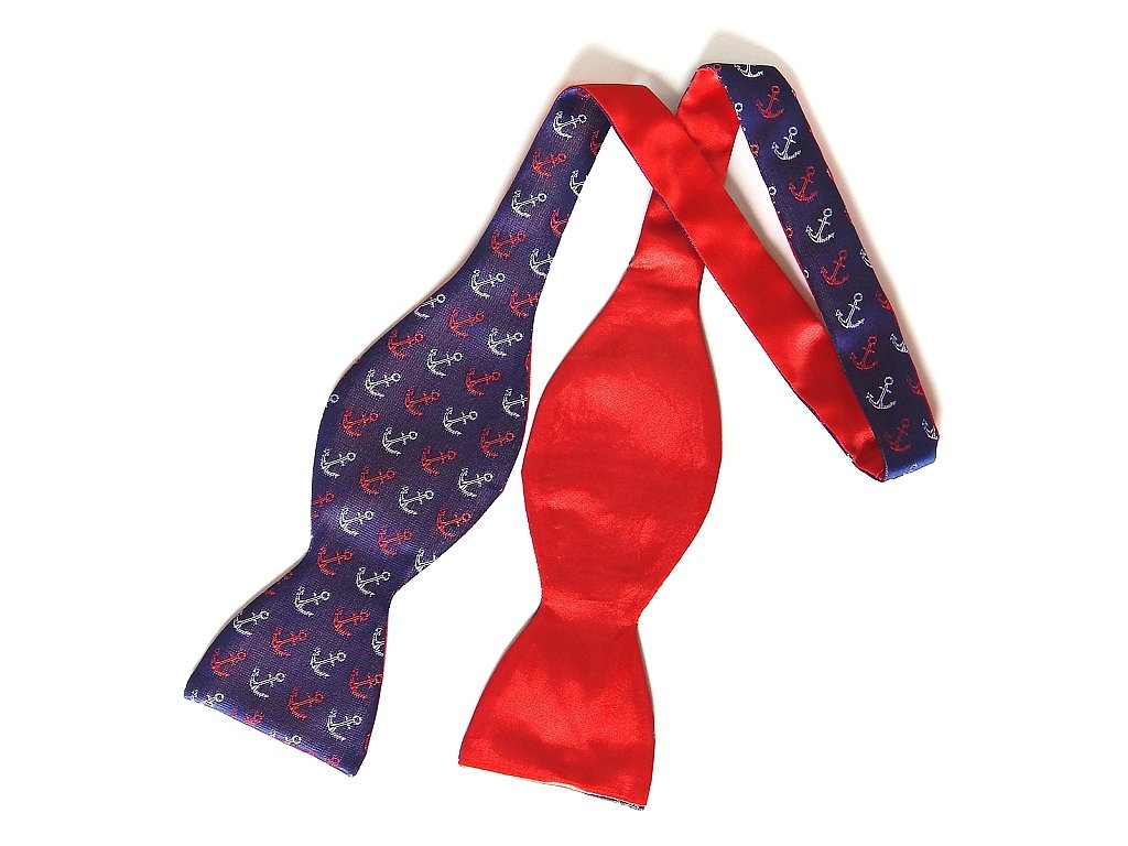 Oboustranný motýlek s námořnický motivem nabízí hned dvamožné varianty nošení. Záleží, jak si ho uvážete. Preferujete vtipný námořnický vzor s kotvami nebo námořnickou červenou?