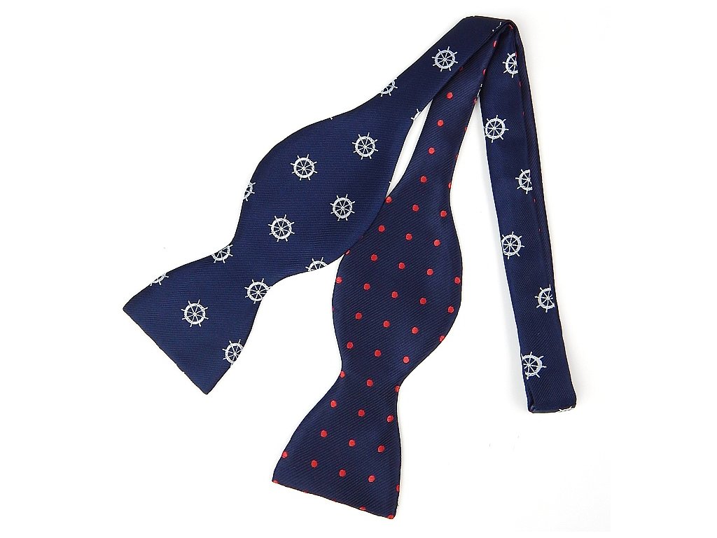 Oboustranný motýlek s námořnický motivem nabízí hned dva možné varianty nošení. Záleží, jak si ho uvážete. Preferujete vtipný námořnický vzor s kormidlem nebo jednoduché modro-červené puntíky?