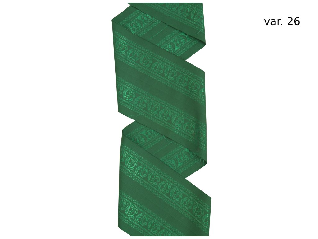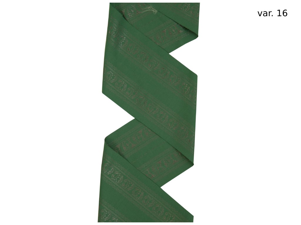 The ribbons are woven as ordinary meter goods with the possibility of cutting the material in the gap and thus obtain a wide costume ribbon. This motif is modeled on a model preserved in the Chodsko area. Costume ribbons can be sewn on various costume parts or grind on the sewing machine and use in the usual way.