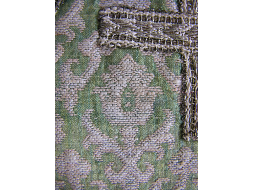 Pomegranate and Carnation - Replica of a Semi-Silk Fabric from the 16th-17th Century. Patterned based on the analysis of a preserved chasuble from Kratochvíle Castle. The fabric in this original color scheme was designed under the supervision of the National Heritage Institute in České Budějovice for use on a Renaissance bed at Vimperk Castle. The original fabric was woven in Italy around 1600 as a double weave using natural silk combined with cotton and linen. The pattern alternates motifs of pomegranates and carnations.