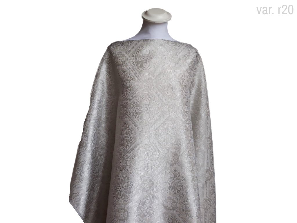 "SILVER BROCADE WITH CROSSES" is a luxurious and richly decorated textile, characterized by its radiant silver sheen and striking cross patterns. This brocade is known for its sophisticated craftsmanship and symbolic design, which often references religious or historical themes. Due to its bold aesthetic, it is widely used in liturgical garments, ceremonial decorations, and as part of opulent interior accents.