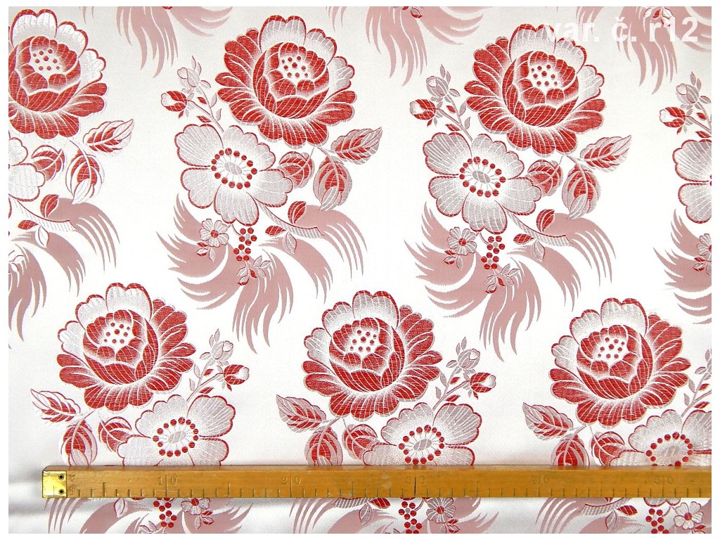 Costume brocade - a unique textile material with woven floral patterns. A wide range of color variations, some complemented by woven rexor. Costume brocade is produced for specific regions for the production of national costumes, costume skirts, aprons, and other costume components.