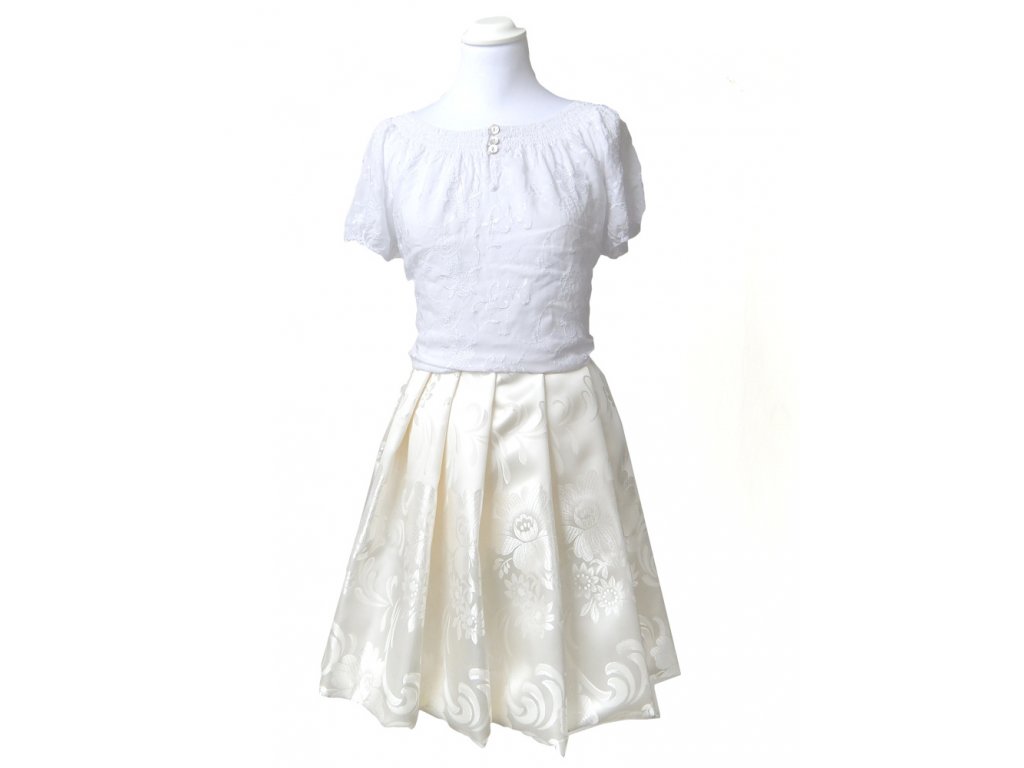 Costume brocade - a unique textile material with woven floral patterns. A wide range of color variations, some complemented by woven rexor. Costume brocade is produced for specific regions for the production of national costumes, costume skirts, aprons, and other costume components.