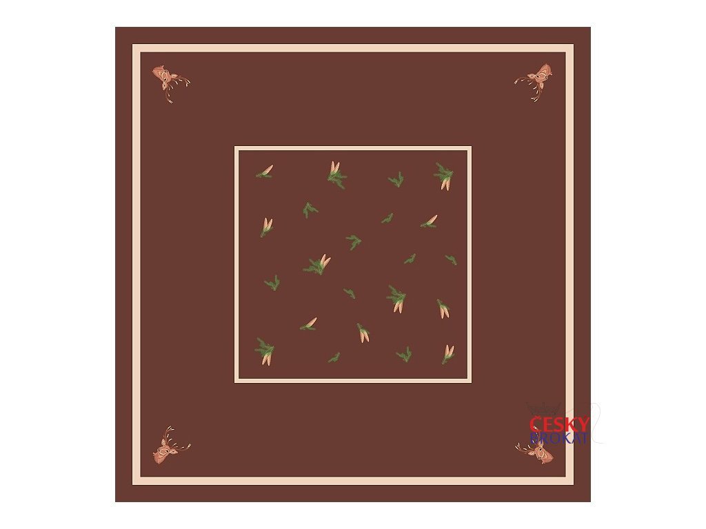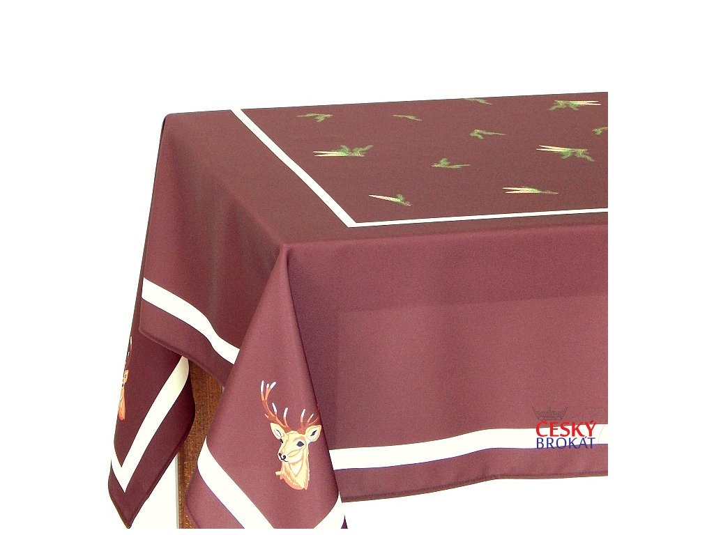 High-quality polyester tablecloth from a Czech manufacturer , with a printed pattern of a deer placed in the corners and the center of the tablecloth are filled with symmetrically placed antlers. The background color of the tablecloth is brown.