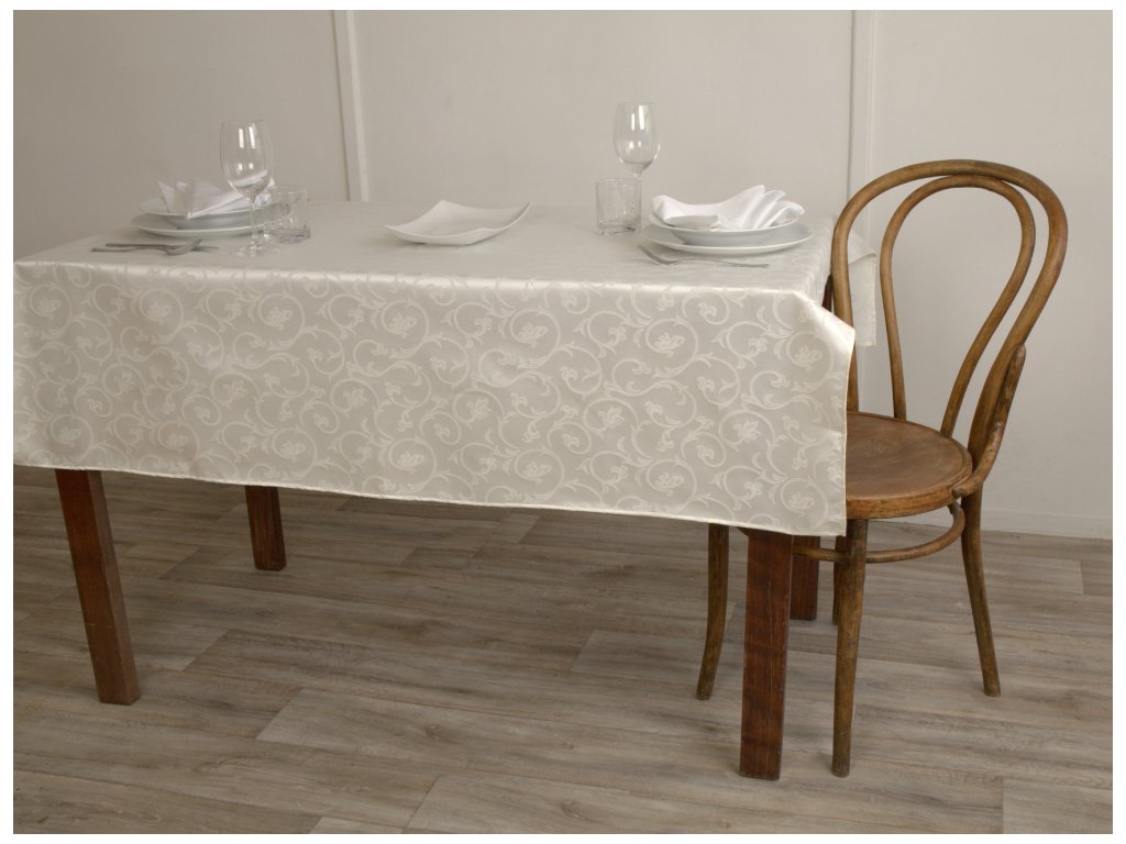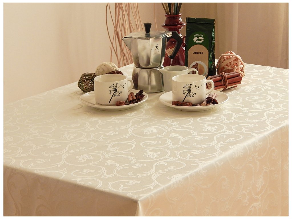 Kvalitní žakárský ubrus Odaska s vytkaným vzorem, vhodný pro slavnostní tabule i pro klidné posezení běžného dne.