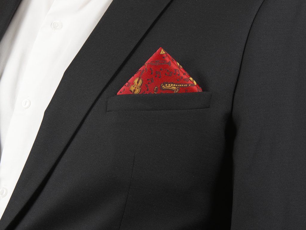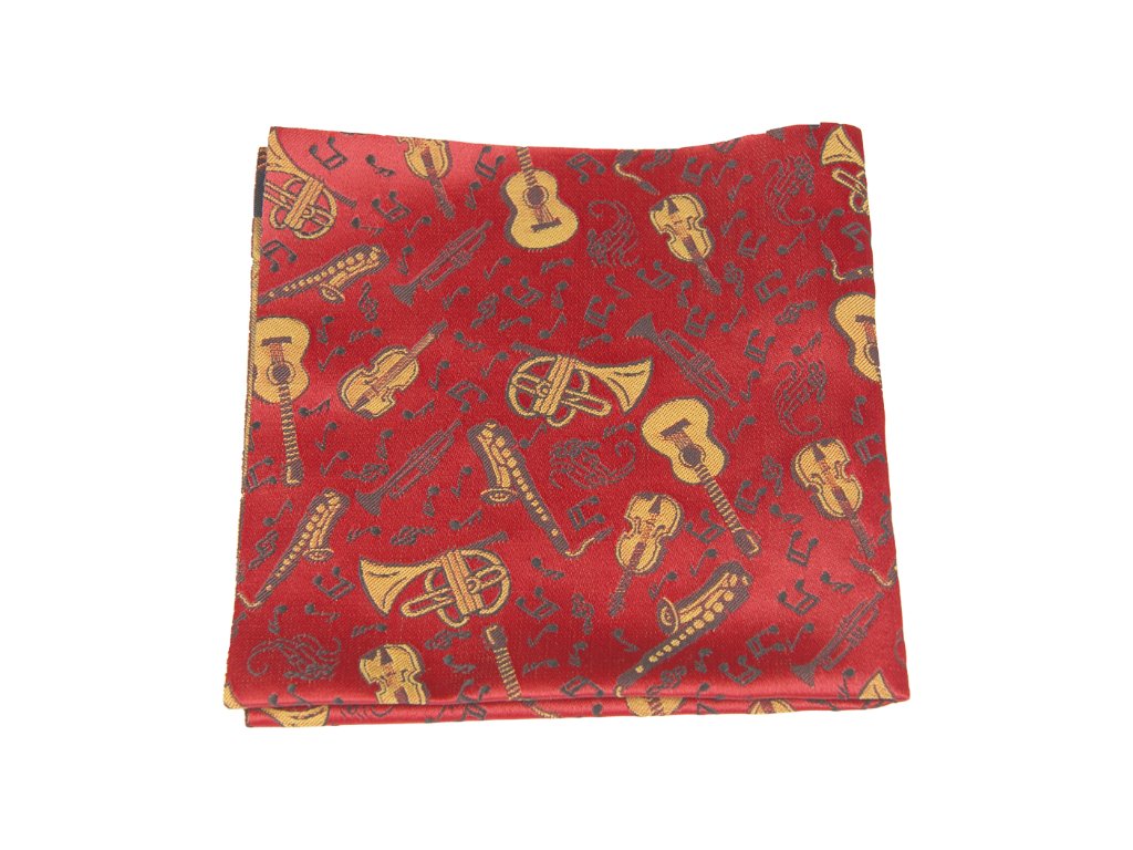 Elegantní kapesníček s výrazným vzorem Hudebních nástrojů je vkusným doplňkem.