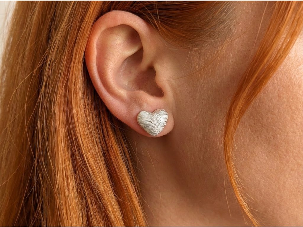 Elegantní a jemné náušnice ve tvaru srdíček, ručně vyrobené z luxusního brokátu a kravatoviny ve stříbrném odstínu. Ideální doplněk pro romantické duše, milovnice originality a všechny, kdo mají rádi decentní lesk s kapkou elegance.