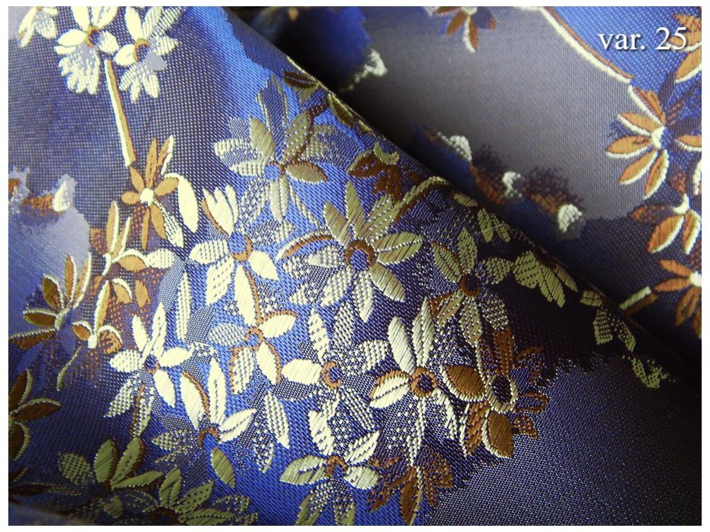 Krojový brokát - jedinečný textilní materiál s vytkanými květinovými vzory. Velká škála barevných variací, tyto v zemitých tónech. Krojový brokát vyrábíme pro jednotlivé oblasti na výrobu národních krojů, krojových sukní, fěrtochů a dalších krojových součástí.