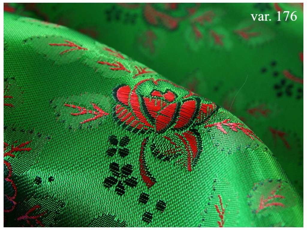 Krojový brokát - jedinečný textilní materiál s vytkaným květinovým vzorem. Velká škála barevných variací, některé doplněné vetkaným rexorem. Krojový brokát vyrábíme pro jednotlivé oblasti na výrobu národních krojů, krojových sukní, fěrtochů a dalších krojových součástí.