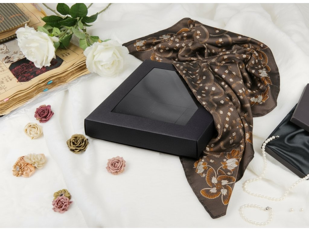 Tento klenot vznikl podle předloh mistrů tkalců ze vzorovacích knih z roku 1908, je z jemného pravého hedvábí a každý detail je ručně obšíván našimi šikovnými švadlenami. Šátek se utkal na tkalcovském stavu v malebném městě Rýmařově, v podhůří Jeseníků, a každý kus je tak unikátním spojením české tradice, péče a elegance. Pro dokonalé uchování a půvabné darování je šátek dodáván v elegantní černé krabičce.