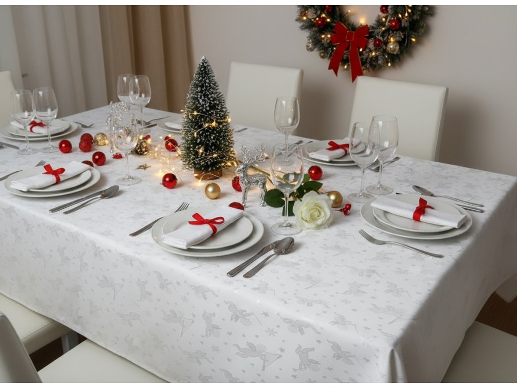 Vánoční ubrus s motivem andílka. Ubrus má teflonový povrch, takže se nemusíte bát vylitých tekutin a mokrých fleků. Všechny takovéto "mokré nehody" stačí odsát papírovou utěrkou nebo savým hadříkem.